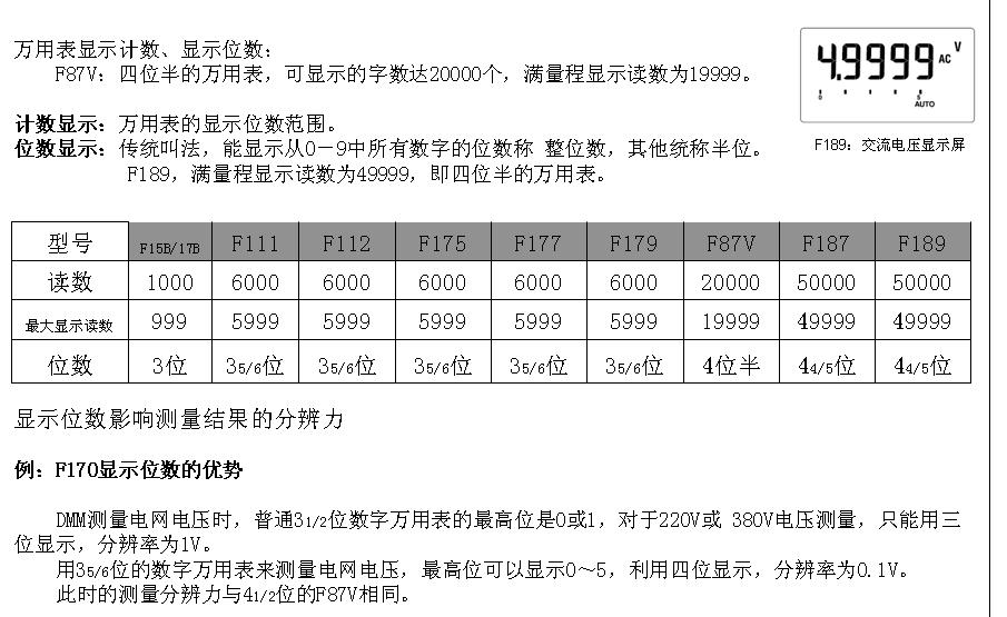 关于万用表位数,尤其是半位的说法,下面是某培训文档里的一个页面,看一下就明白了。简言之,读数的最高位不能达到0~9满刻度的,最高位就只能算一个分数位,如果统称的话,都可以称半位,如果具体一点,有1/2位,2/3位,4/5位,。。。8/9位。譬如说图中的4 1/2位的F87V,4 4/5位的F187,F189,都可以统称为4位半,但其实精度还是有区分的。更精度的描述万用表位数的其实还有一个count数的表述,就是下面图中的读数一栏的指标。譬如F187的count数是50000 , F87V的count数是20000.我们的万用表count数是240000.即从000000~239999。