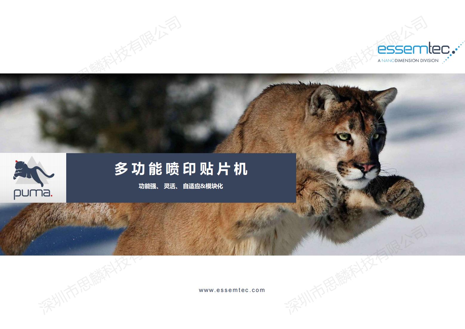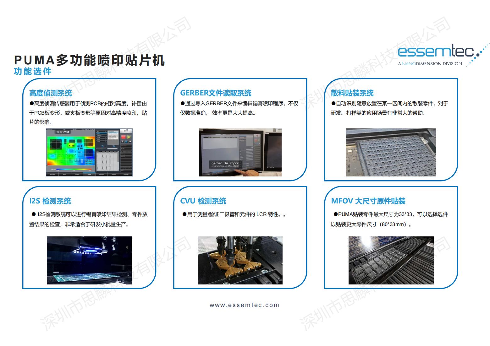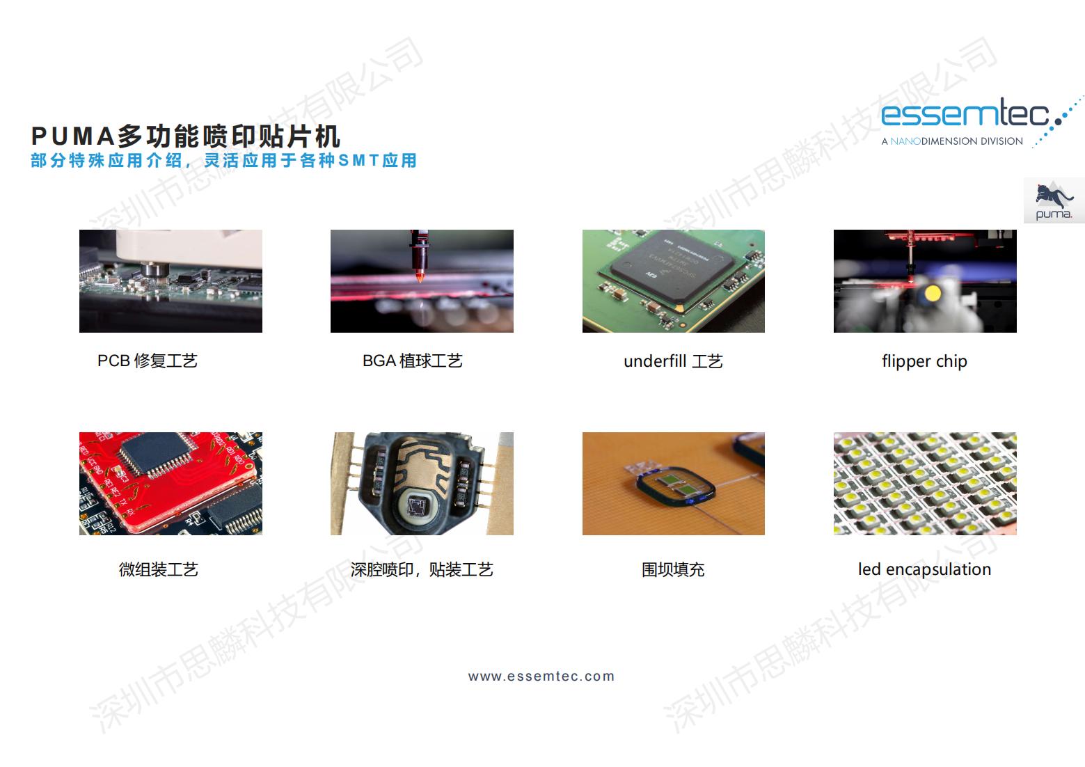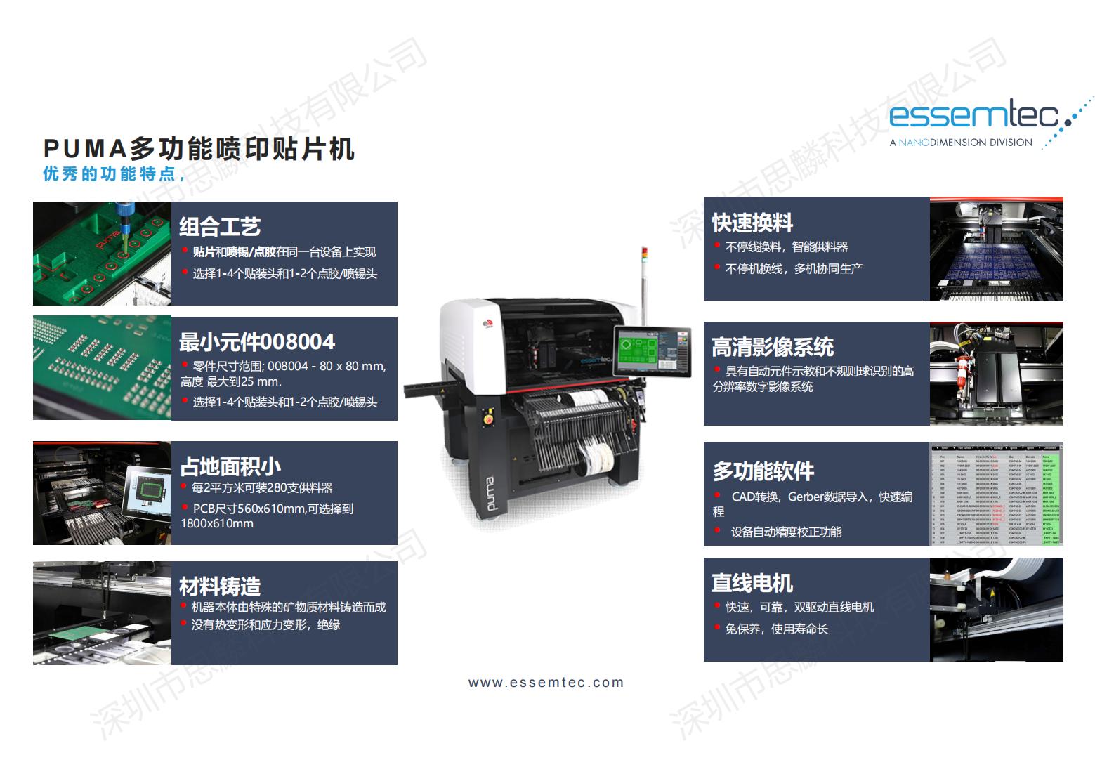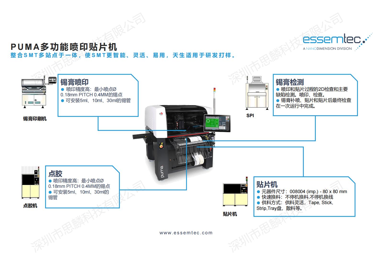 产品描述:PUMA贴片机是瑞士ESSEMTEC公司在瑞士研发制造的一款既可以点胶、喷锡,又可以贴片的高柔性SMT加工设备,适合应用于多品种,小批量的贴装生产,更适合各大研究机构自制产品的生产以及大型生产企业的样品试产。 ESSEMTEC全球首创的将高速喷锡,点胶整合于高精度贴装设备中,不仅大大缩短了研究单位生产自制产品的时间,更是解决传统钢网丝印工艺不能解决的很多工艺难题。