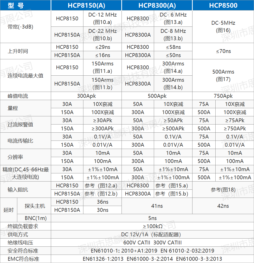 HCP8150(A)钳口可夹住直径达20mm的导线,适用于大电流应用场合;可以测量150A的连续电流和300A的峰值电流,HCP8150提供了12MHz的带宽,HCP8150A提供了22MHz的带宽;探头具有150A (100X)和30A (10X)两个量程可选择,10X量程用于小电流测量,分辨率高达10mA。