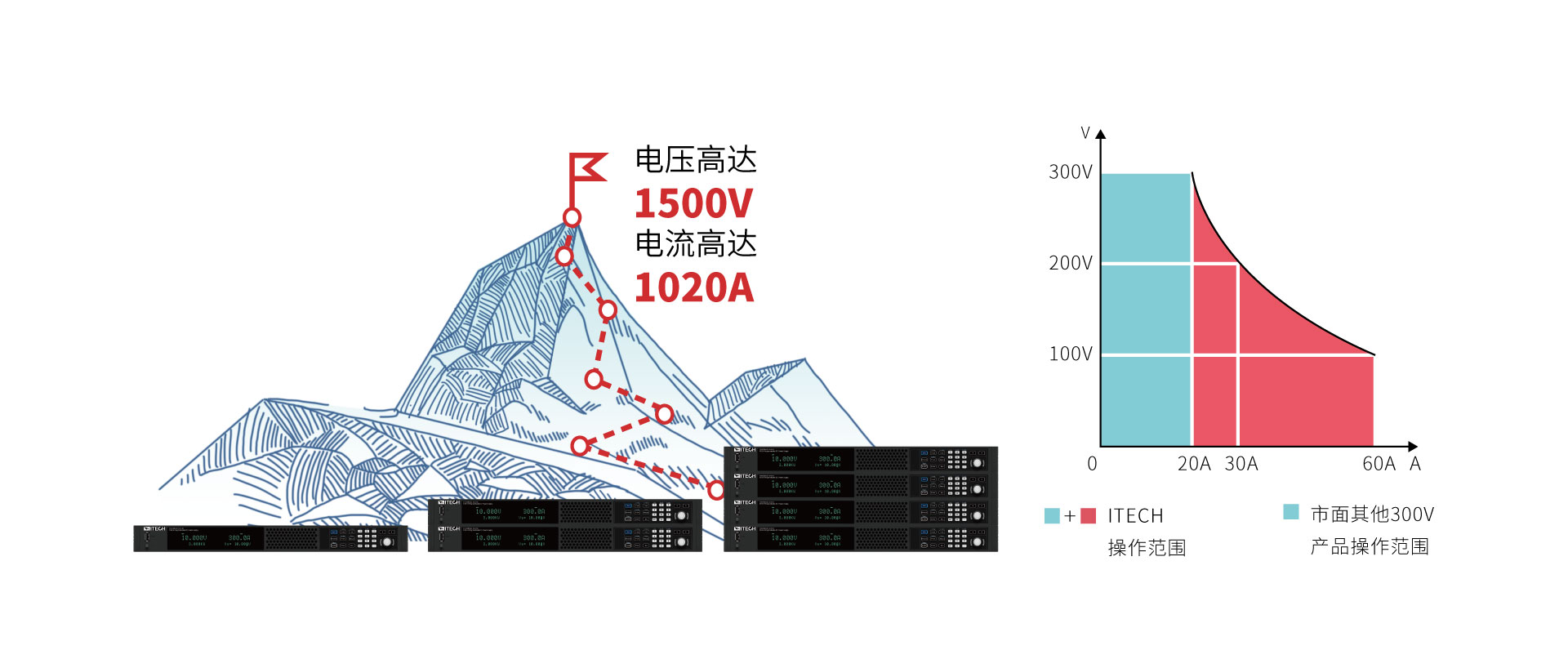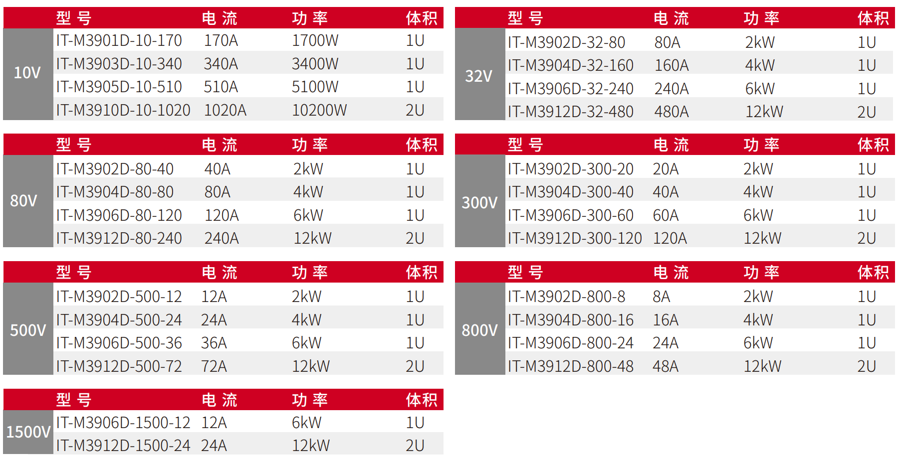 IT-M3900D全系列共有25个型号,输出电压从10V~1500V,输出电流最大可达1020A。采用宽范围的输出设计,相较于传统固定范围输出直流电源,为用户提供了更多的电压和电流组合,让使用更加灵活。单台电源就可以涵盖用户广阔范围的应用需求,大幅降低电源系统搭建的复杂度及占用空间。