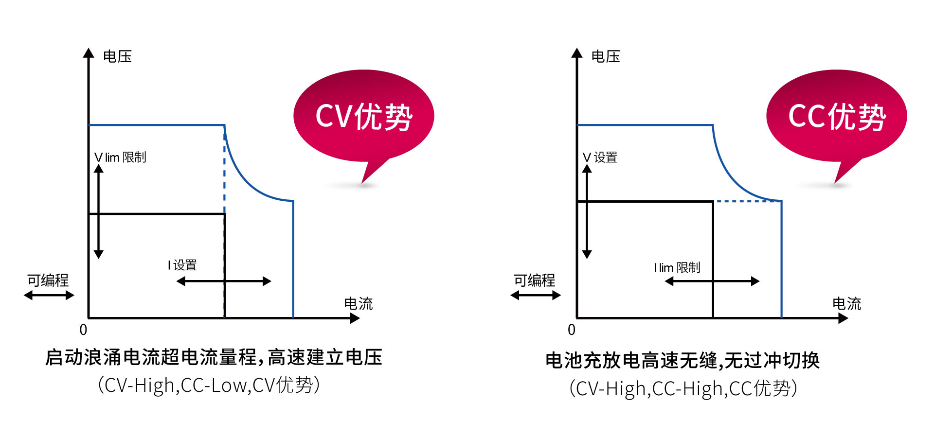 CC/CV优先权可以持续帮助用户解决长期测试应用中的各种严苛问题,使需求电源高速或者无过冲等应用,变得更加灵活。IT-M3900D的CC&CV优先权功能让用户可以选择CC/CV环路的响应速度以及环路工作模式,来决定输出是电压高速模式还是电流无过冲模式,适用于诸如大功率集成电路的测试、充放电测试、汽车电子的电源瞬变仿真和表征等。