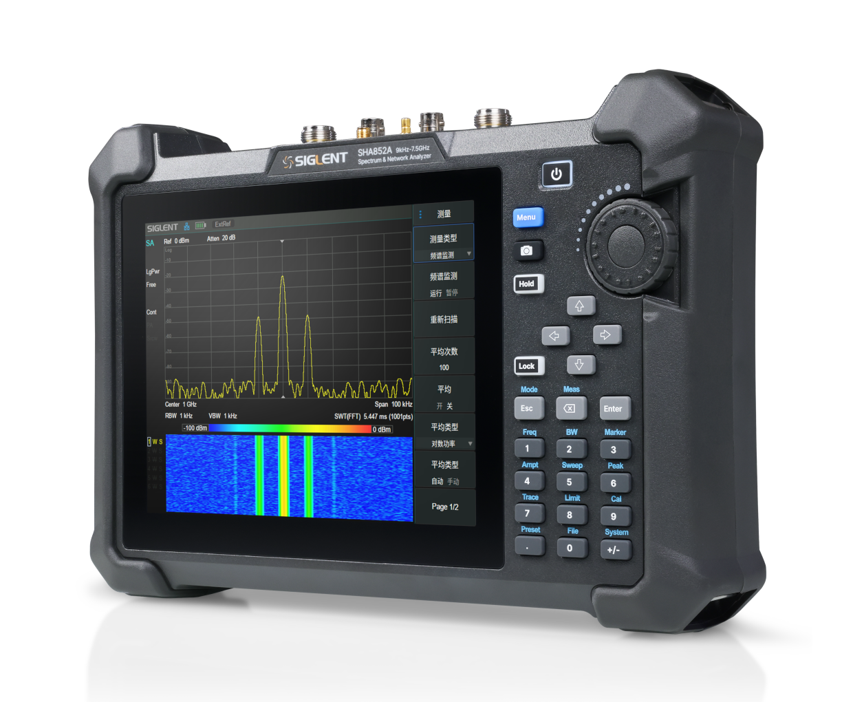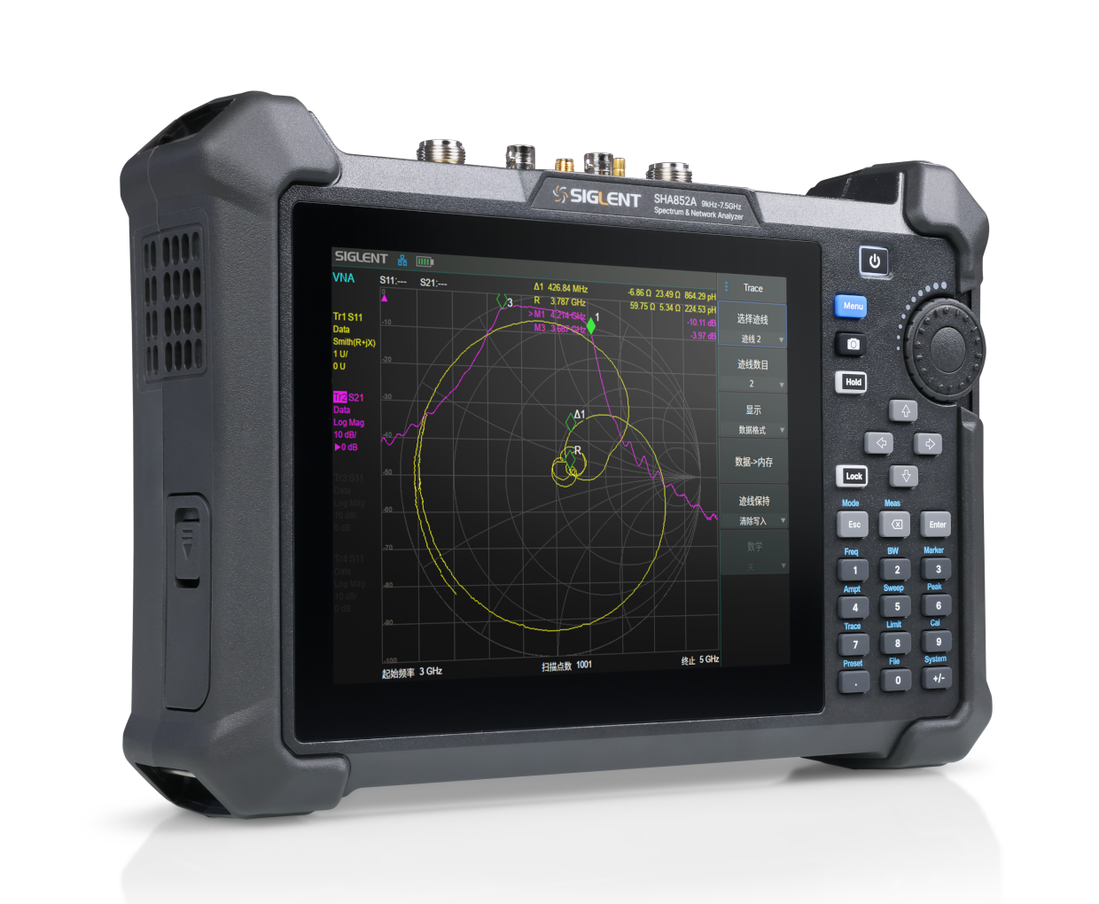 SHA850A系列手持式频谱分析仪频率范围 9 kHz~7.5 GHz,机身更轻盈,适合外出携带、手持操作,采用续航长达4小时的电池供电,并且可配置GPS定位功能,能满足各种场景下的现场测试,如通信基站,汽车OTA测试,频谱监测等。