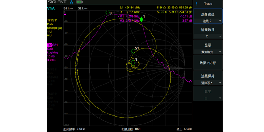 显示反射/传输系数,回波/插入损耗,相位,群时延,驻波比,Smith圆图,极坐标圆图等多种格式。