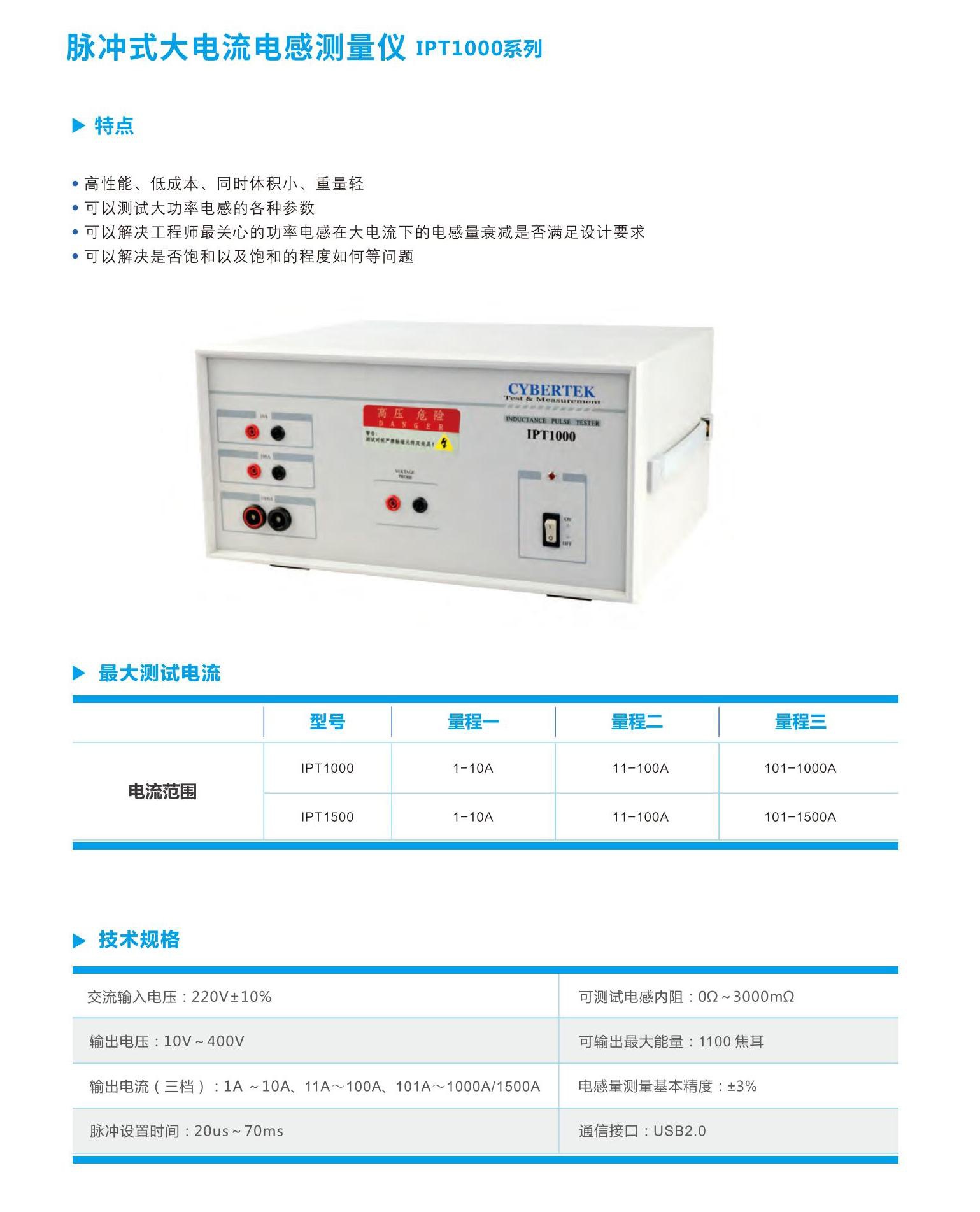 随着大功率电力电子和新能源产品的高速发展,功率电感的电流定额也日益增长,目前已经有超过1500A电流的功率电感的需求。工程师最关心的是功率电感在大电流下的电感量衰减是否满足设计要求,是否饱和以及饱和的程度如何。这个问题对设计一个高可靠性低成本的电力电子和新能源产品至关重要。对此我们设计了一款脉冲式大电流电感测试仪IPT1000/IPT1500(媲美德国ED-K DPG10-1000B),具有高性能、低成本、体积小、重量轻等优势: